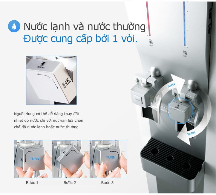 » Nước lạnh và nước thường được cung cấp bởi 1 vòi. Người dùng có dễ dàng thay đổi nhiệt độ nước chỉ với nút vặn lựa chọn chế độ nước lạnh hoặc nước thường.