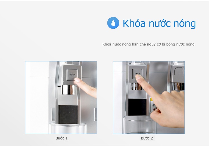 » Vòi nước nóng được thiết kế nhằm ngăn ngừa bỏng khi lấy nước với phím điều chỉnh an toàn. Điều này đặc biệt có ý nghĩa đối với những gia đình có trẻ nhỏ.