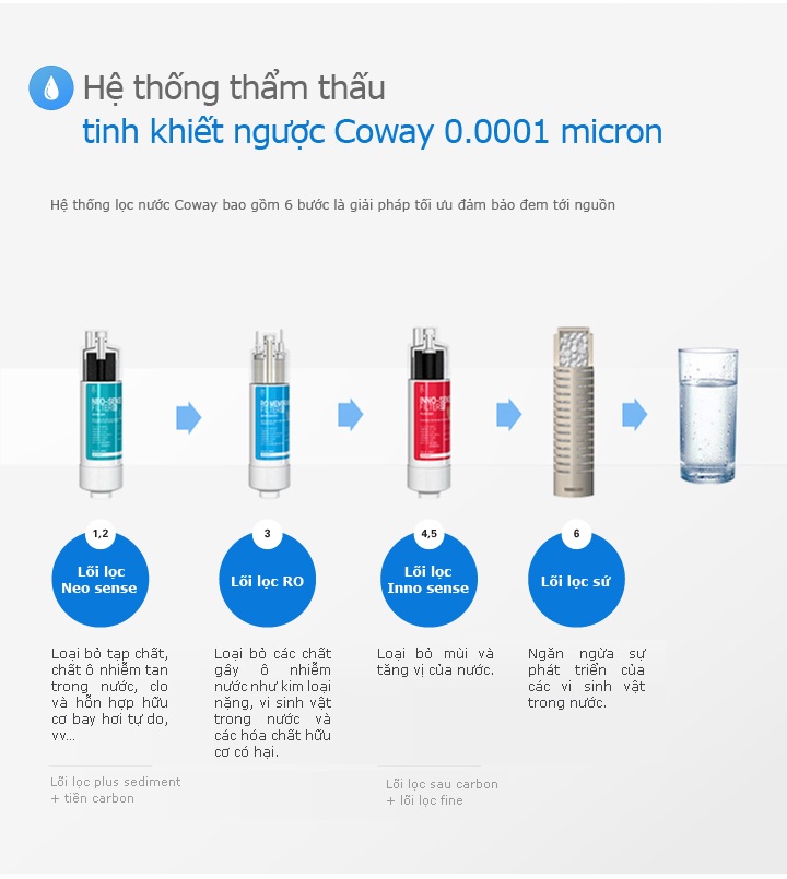 Hệ thống lọc nước Coway CHP-06ER trải qua 6 bước lọc hiệu quả