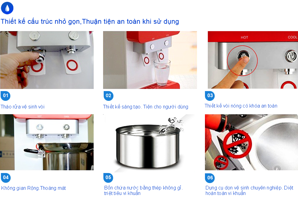 – Với chiếc máy lọc nước này gia đình bạn cũng như những nơi công sở, công ty, bệnh viện, trường học…mà bạn không phải mất tiền mua nước bình để uống hàng ngày, không phải mất thời gian đun nước nóng bằng ga, không mất tiền mua ấm siêu tốc, bếp đun nước, các loại vật dụng chứa nước… rất hữu ích và tiện dụng.