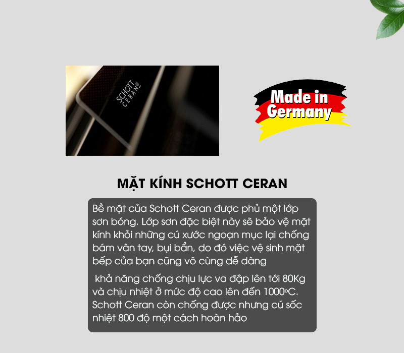 Sản xuất tại Mainz – Đức, nơi luôn đi đầu các xu thế phát triển công nghệ nên gốm kính Schott Ceran có cấu tạo đặc biệt, có khả năng chống chịu lực va đập lên tới 80Kg và chịu nhiệt ở mức độ cao lên đến 1000ºC. Schott Ceran còn chống được nhưng cú sốc nhiệt 800 độ một cách hoàn hảo. Bên cạnh đó, gốm thủy tinh cao cấp Schott Ceran còn là loại chất liệu thân thiện với môi trường không chứa các kim loại nặng độc hại asen và antimony, không dẫn điện, dẫn nhiệt, không bị nứt vỡ nên an toàn với người sử dụng.