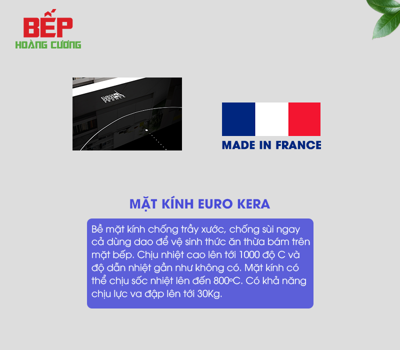 Mặt kính Eurokera được thiết kế trên dây truyền sản xuất đạt chứng nhận ISO14000 chuẩn Châu Âu, phải trải qua quá trình sản xuất nghiêm ngặt dưới bàn tay khéo léo của các chuyên gia đầu ngành gồm: Nung nóng và dát mỏng, cắt kính, kiểm định chất lượng, tráng men, gia công chống tràn, chống bám bẩn, ma sát, rạn nhiệt và khâu cuối cùng là gia nhiệt qua lửa trước khi xuất xưởng. Do đó mà Euro Kera có khả năng chịu lực chịu nhiệt tốt, chống lại cả những cú sốc nhiệt đột ngột lên tới 800ºC