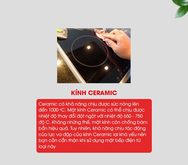 Kính Ceramic hay còn gọi là sứ thủy tinh, là một trong những loại mặt kính bếp điện từ rất hay gặp hiện nay. Bề mặt kính có cấu tạo nhiều Silic, cho nên Ceramic có khả năng chịu được sức nóng lên đến 1000 ºC. Mặt kính Ceramic có thể chịu được nhiệt độ thay đổi đột ngột với nhiệt độ 650 - 750 độ C. Không những thế, mặt kính còn chống bám bẩn hiệu quả. Tuy nhiên, khả năng chịu tác động của lực va đập của kính Ceramic lại khá yếu nên bạn cần cẩn thận khi sử dụng mặt bếp điện từ loại này, cần hạn chế đặt nồi có trọng lượng quá 10kg lên bếp. Kính cũng dễ bị vỡ kính nếu cho mặt bếp nóng tiếp xúc trực tiếp với nước lạnh hoặc vật lạnh…